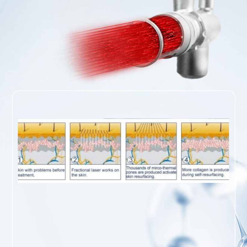 Фракційна технологія забезпечує глибоке проникнення лазерного променя, що сприяє швидкій регенерації шкіри та зменшенню зморшок і рубців